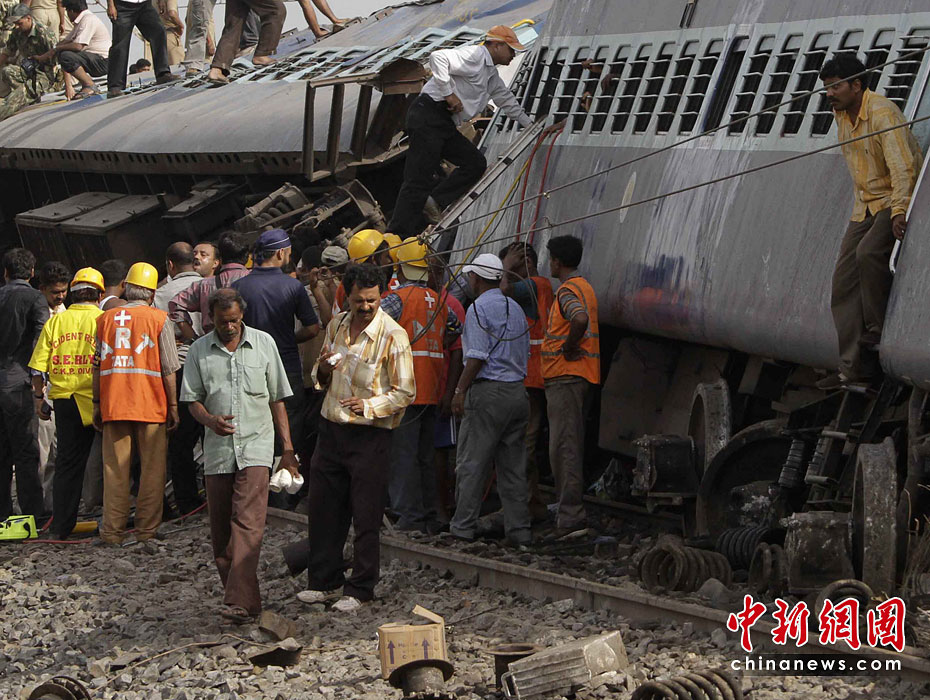 當(dāng)?shù)貢r(shí)間5月28日,印度一列特快列車(chē)在東部西孟加拉邦的西米德納布爾遭反政府武裝襲擊脫軌,造成百余人死傷。圖片來(lái)源:中國(guó)新聞網(wǎng)