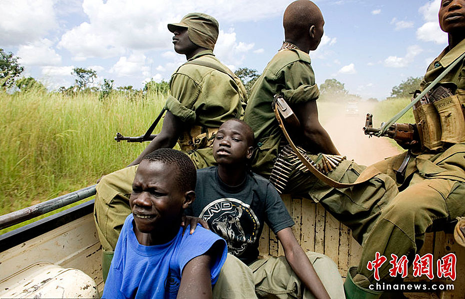 學(xué)校放假了,Ronald(左)和Ongom(右)乘卡車回到烏干達(dá)帕德爾境內(nèi)流民營(yíng)。Ronald(左)和Ongom(右)以前都是兒童軍。在穿越叛軍活動(dòng)頻繁的地區(qū)時(shí),有士兵保護(hù)他們的安全。圖片來(lái)源:CFP