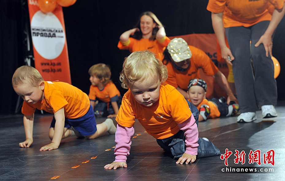 當地時間5月31日,烏克蘭基輔舉行了寶寶爬行大賽。數十名嬰兒在母親的鼓勵下奮力向4米外的終點爬去。圖片來源:中國新聞網