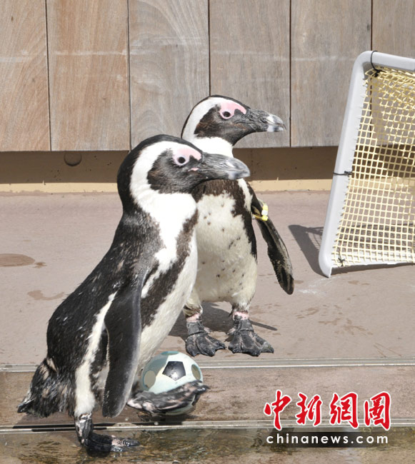 企鵝水族館里“踢足球”迎接世界杯