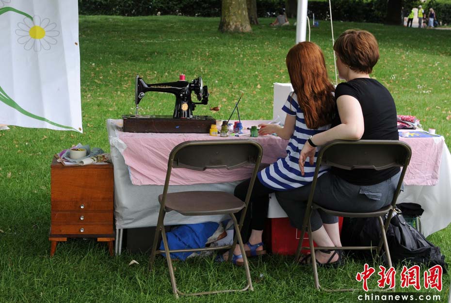 當地時間2010年6月6日,英國倫敦舉行卡姆登綠色市集(Camden Green Fair),這是英國倫敦每年環保領域的“重頭戲”。本屆市集的主旨是要喚起大眾對環境問題的關注,選擇更加可持續發展的生活方式。據活動主辦方預計,本屆市集將吸引來自英國各地和世界各國的2萬多人參加。圖為一對母女在做手工。桌子上的老式縫紉機讓人有重回舊時光的感覺。Fiona/攝 Fiona 馬小剛/文
