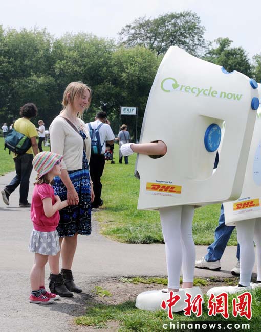 當地時間2010年6月6日,英國倫敦舉行卡姆登綠色市集(Camden Green Fair),這是英國倫敦每年環保領域的“重頭戲”。本屆市集的主旨是要喚起大眾對環境問題的關注,選擇更加可持續發展的生活方式。據活動主辦方預計,本屆市集將吸引來自英國各地和世界各國的2萬多人參加。圖為志愿者穿著電水壺模型向游客講解回收廢舊家用電器的重要性,號召人們從節約資源、防止化學污染兩方面考慮都要盡量回收廢棄的家用電器。Fiona/攝 Fiona 馬小剛/文