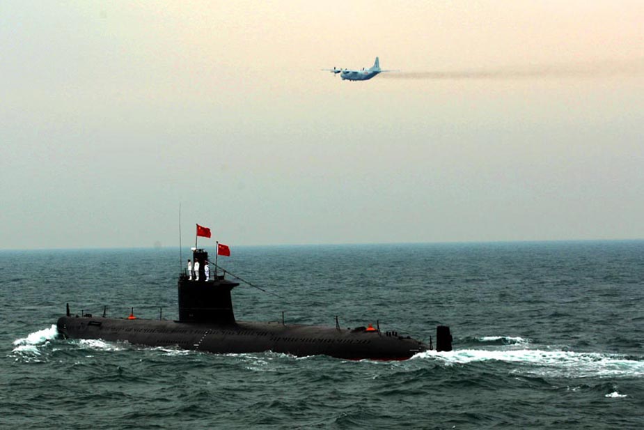 4月23日下午,為紀念中國人民解放軍海軍成立60周年而舉行的海上閱兵在青島附近黃海海域舉行。長征6號、長征3號核動力潛艇和長城218號、長城177號常規動力潛艇依次接受檢閱。 中新社發 宋吉河 攝