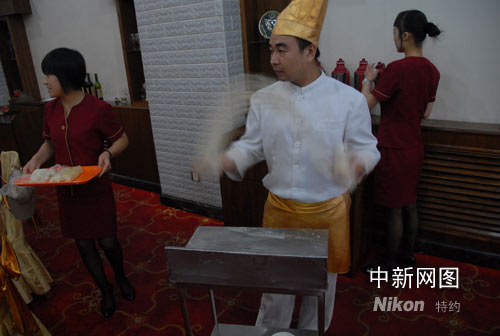 蘭州人吃牛肉面吃出了名堂,吃上了癮。如今,蘭州市的每條街巷,無論大小,至少都有一兩家牛肉面館。黃河岸邊的古城蘭州,彌漫在大街小巷的,永遠有那股牛肉面的清香。“蘭州人三天不來個‘牛大碗’就心火難捺”。聽起來有點夸張,不過,牛肉面確實已成為蘭州人生活中不可或缺的一部分。別以為煮面條加上牛肉片就是牛肉面了。蘭州牛肉面的精致與吃法考究令人瞠目。觀看拉面好像是欣賞雜技表演,拉面師傅操起面節,一搓一拉,連抻數次,即變戲法似地拉繞出一碗細長的面條拉到最后時的“一拉一閃”又仿佛是舞蹈演員在揮舞著彩帶。王紅綱 攝