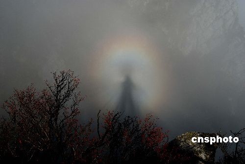 11月4日,廬山出現蔚為壯觀的云海,同時連續三次出現神奇的“佛光”,每次時間長達一小時左右,令來廬山的許多中外游客和攝影師們大飽眼福。廬山位于長江中游南岸江西省九江市南,鄱陽湖濱,大山、大江、大湖渾然一體,素以“雄、奇、險、秀”聞名于世。圖為4日廬山五老峰上出現的神秘的“佛光”奇觀。中新社發 胡國林 攝