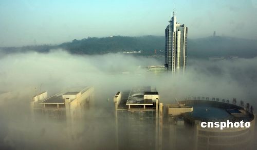 11月7日,重慶大霧,山城煙蒸霧繚,恍臨仙境。11月以來,重慶連續降雨數日,當日一早天氣放晴,受冷空氣影響,山城出現大霧,高樓大廈云中林立,如登廣寒。中新社發 秦楓 攝 < 2008-11-07 18:45:20 >