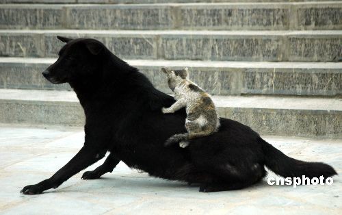 11月16日,一只小貓趴在黑狗的背上。安徽巢湖市居巢區散兵鎮凌山村一農戶家里養著一只花貓和兩條狗。據主人介紹,小花貓因還在喝奶的時候,貓媽媽就病死了,營養不良,所以已經一歲多的小花貓長得很瘦弱,兩條狗卻像貓媽媽那樣愛護著它,小花貓有時很頑皮,騎在狗背上玩耍,構成一幅貓狗一家親令人感動的圖畫。中新社發 徐振華 攝
