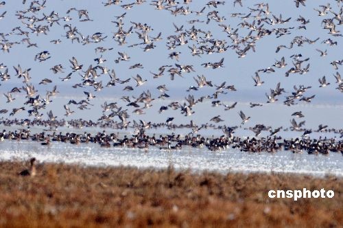 12月20日,大群雁類和鷸類候鳥在江西鄱陽湖星子縣沙湖山沙湖池上空飛翔。目前,中國第一大淡水湖江西鄱陽湖候鳥保護區八大湖池越冬棲息的珍禽候鳥總數已達30萬只,包括白鶴、白鸛等國家一級保護鳥類,以及雁類、鷸類、小天鵝、野鴨等珍禽候鳥。中新社發 段長征 攝