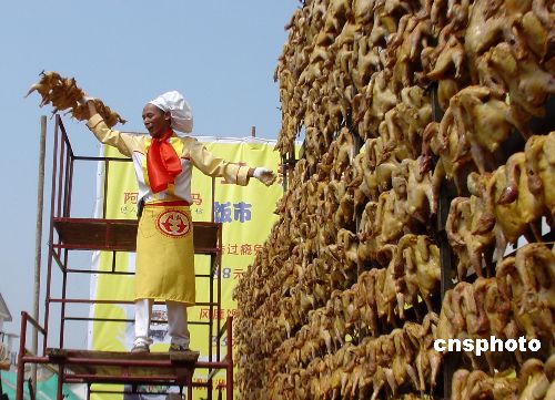 10月19日,在廣西南寧舉行的第17屆中國廚師節暨東南亞國際旅游美食節上,廣西廚師阿炳師傅一人同時燒烤2008只雞沖刺吉尼斯世界記錄,以此舉迎接2008年奧運會在北京舉行。中新社發 楊志雄 攝