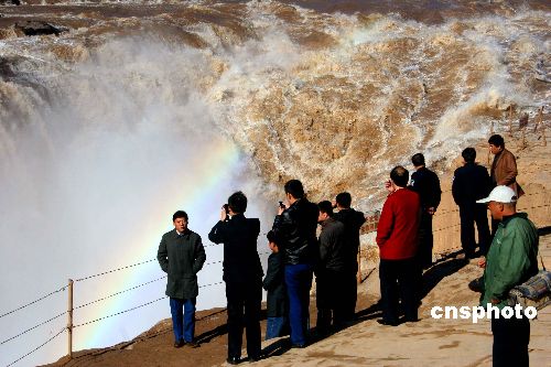 11月20日,氣勢磅礴的黃河壺口瀑布加上蔚藍的天空和一道金色的彩虹,把黃河壺口瀑布裝扮的格外漂亮,許多游人紛紛趕來欣賞這難得的景觀。中新社發 張旦 攝