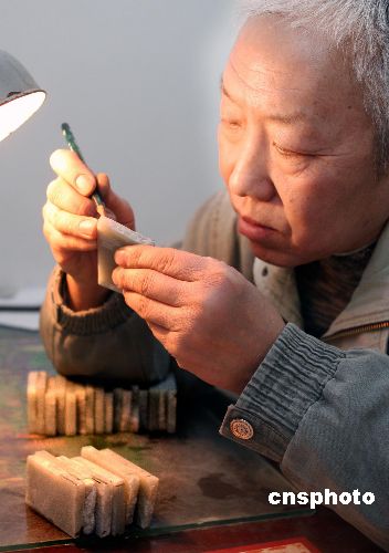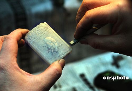 1月11日,北京玉器廠工藝師正在加工2008套12生肖玉牌。這2008套12生肖玉牌為中國國際藝術聯盟制作,作為奧運收藏紀念品將在北京2008年奧運會前完成上市。其圖案由李燕、金鴻鈞等12位中國當代著名畫家創作。中新社發 宋吉河 攝