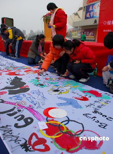1月20日,山東威海舉辦慶祝北京奧運會200天倒計時系列活動,活動項目包括:由34輛奇瑞QQ汽車擺成2008字樣、百名騎自行車的志愿者迎奧運健身行、兒童繪制迎奧運百米長卷,以及百姓撞鐘祈福等內容。中新社發 海云飛 攝