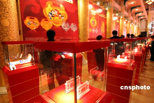 一月二十日,為紀念奧運會倒計時200天,由北京奧組委主辦的主題為“中國印·奧運年·華夏福”奧運特許貴金屬賀歲新品上市推介會舉行。七十款具有中國特色的奧運特許商品,包括中國印、長命鎖、紅燈籠、中國結及中國福等。中新社發 任海霞 攝
