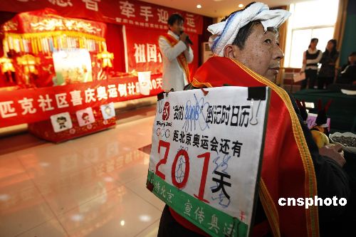 1月20日,山西“驢驢人”倪育生和來自山東的大花轎一起闖進了北京東四奧林匹克社區(qū),為迎接北京奧運會倒計時200天做宣傳。當(dāng)日,來自全國7省市的民間奧運宣傳志愿者齊聚北京,相互交流奧運宣傳經(jīng)驗。中新社發(fā) 杜洋 攝