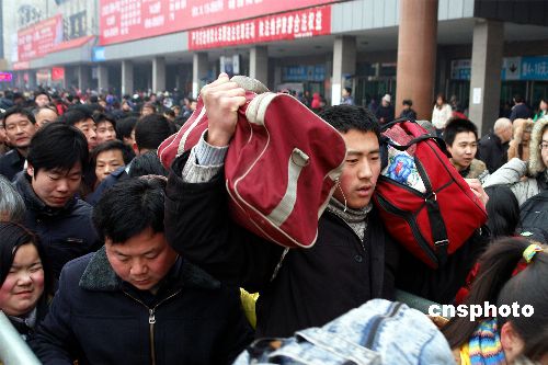 一月二十三日,在河南鄭州火車站進站口,提著大小包裹的打工人員秩序進站。鄭州火車站春運第一天,三日內的車票全部售完,作為中國鐵路大樞紐的鄭州,已提前迎來客流高峰。中新社發 慎重 攝