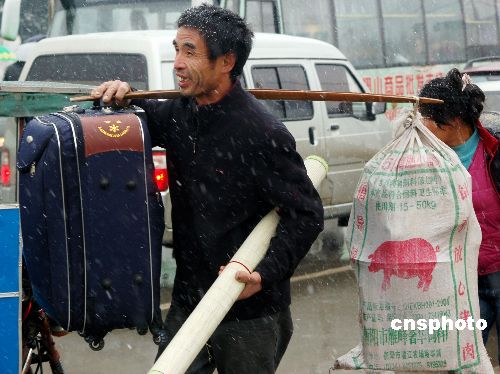 1月26日,一名蘇州外來務工者冒雪挑著回家的行李趕往蘇州火車站。隨著春節臨近,越來越多的在外務工人員踏上了回鄉的旅程。中新社發 邱勇 攝