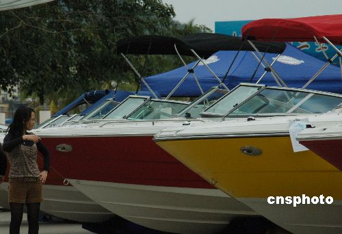 2月8日,游人在三亞鹿回頭廣場參觀豪華游艇。由三亞順業船舶設備有限公司和香港游艇廠商聯合舉辦的2008迎春游艇展覽會繼續在海南三亞鹿回頭廣場舉行,這是三亞首次舉行的大規模游艇展,展覽將持續到2月14日。所展出的圣斯克、夢特威、斯莎等品牌的豪華游艇、摩托艇、快艇以及加拿大龐巴迪品牌旗下的快艇、雪地車、沙灘車等海上運動休閑娛樂產品,春節期間吸引諸多三亞市民和游客參觀。中新社發 尹海明 攝