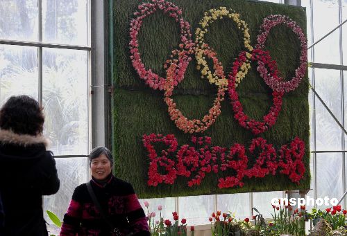 2008年2月14日,湖北武漢市植物園用數(shù)千朵康乃馨組成的北京2008奧運(yùn)會(huì)五環(huán)圖案和各種栩栩如生的體育比賽項(xiàng)目圖案,吸引了前來賞花游園的市民。中新社發(fā) 楚天行 攝