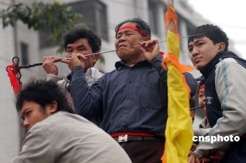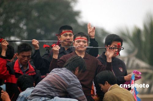 2008年2月16日,瓊海市,祈求五谷豐登,風調雨順。“軍坡”是海南民間的一個傳統節日,相傳源于唐代,為紀念六世紀我國嶺南著名俚人首領冼夫人而舉行的祭祀活動,距今已有1300多年歷史。獨特的民俗風情吸引了大批游客。中新社發 蒙鐘德 攝
