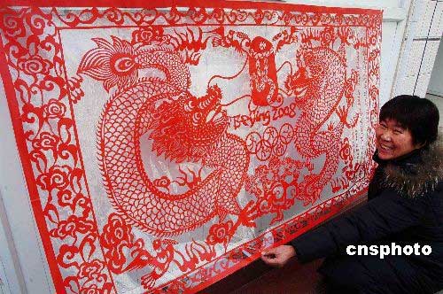 河南周口市剪紙女藝人陳雪英用了一周時間創作出剪紙作品“龍迎奧運”。該幅作品長2米,寬1米,上刻有雙龍飛騰,奧運五環、福娃踏云、吉祥白鴿及北京2008等圖案和字樣。以中華民族的圖騰龍為主題的迎奧運作品充分表達了作者對北京奧運的期盼和祝福。中新社發 楊正華 攝