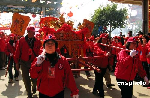 2月27日,馬祖境媽祖金身鑾駕抵達連江縣壺江島,受到當地信眾熱烈歡迎。據悉,此次馬祖鄉親二百人組團攜媽祖金身,前來參加在連江壺江舉辦的連江縣第二屆媽祖文化節,這是二百多年來,馬祖境馬港天后宮媽祖金身首次回到祖鑾。中新社發 林維莉 攝