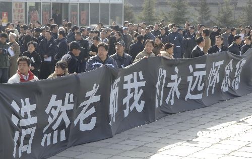 數(shù)百位專程從河北三河市趕來的市民打出悼念浩然的長(zhǎng)幅。