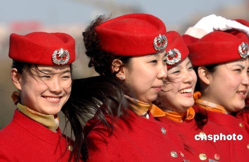 三月三日,北京天安門廣場,女服務員笑容燦爛迎“兩會”。當日下午,全國政協十一屆一次會議在北京人民大會堂隆重開幕。中新社發 王東明 攝