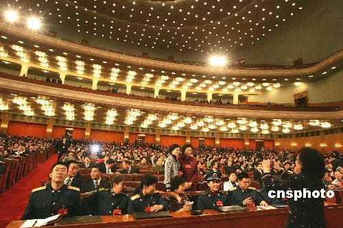3月4日上午,第十一屆全國人民代表大會第一次會議在北京人民大會堂舉行預備會議,表決產生十一屆全國人大一次會議主席團和秘書長,通過十一屆全國人大一次會議議程。主持會議的十屆全國人大常委會委員長吳邦國宣布:十一屆全國人大一次會議于3月5日召開。圖為會議開始前代表抓緊時間拍照。中新社發 任晨鳴 攝