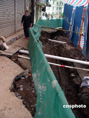 3月21日,湖北宜昌城區(qū)力行二街35號8層高的住宅樓豐澤苑地基發(fā)生陷塌后的現(xiàn)場,施工方已將陷塌物部分清理后準備對地陷進行加固。據(jù)悉,3月19日晚,宜昌城區(qū)力行二街35號8層高的住宅樓豐澤苑地基突然發(fā)生陷塌,一些居民連夜撤離;陷塌處長約10多米,寬約5米。居民們認為,豐澤苑住宅樓5米外的地方有一塊正在開發(fā)的地基已挖了10多米深,正因這處較深的地基與豐澤苑住宅樓地基太近,才導致出現(xiàn)了陷塌險情。豐澤苑住宅樓于2001年建成,住有40多戶居民(其中,一樓為商業(yè)門面),一個多月前,塌陷處的表面就已發(fā)現(xiàn)裂縫,施工人員曾對裂縫處作過灌漿處理。中新社發(fā) 劉君鳳 攝