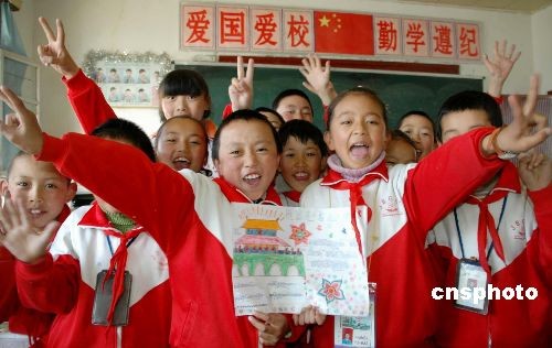 3月27日,拉薩市城關區吉崩崗小學四年級的學生表達熱愛祖國反對分裂的心情。拉薩“3.14”打、砸、搶、燒暴力事件發生后,西藏各界以各種方式紛紛表達對暴亂分子殘忍罪惡行徑的痛恨。中新社發 周波 攝