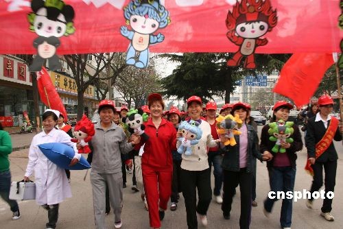 4月7日,河南南陽市臥龍區(qū)60多位社區(qū)大媽以慢跑形式,迎接北京奧運會。本次名為“春暖花開迎奧運”的慢跑活動,總路程為五公里,大媽們以飽滿的精神、驕健的步伐充分釋放喜迎奧運的激動心情。中新社發(fā) 付海厚 攝