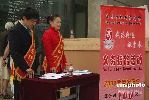 4月29日,在北京奧運(yùn)會(huì)倒計(jì)時(shí)100天即將到來(lái)之際,北京市規(guī)劃展覽館在前門東大街開展“我為奧運(yùn)獻(xiàn)青春 義務(wù)指路活動(dòng)”,為國(guó)內(nèi)外游客提供義務(wù)指路服務(wù)。中新社發(fā) 九州 攝