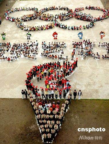 4月28日下午,四川省華鎣市古橋初中、華鎣市職業(yè)中學(xué)、華鎣市國家稅務(wù)局等部門的1500多名學(xué)生、教職員工,一起組成“祝奧運(yùn)成功”五個大字及火炬、五環(huán)、福娃等奧運(yùn)圖案,迎接北京奧運(yùn)會倒計時100天的到來。 中新社發(fā) 邱海鷹 攝