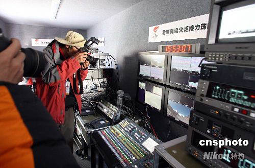 4月30日,采訪2008北京奧運會火炬接力珠峰展示活動的中外媒體記者,集體探訪珠峰大本營,首次進入中國中央電視臺(CCTV)設置在珠峰大本營的電視直播間和電視直播車。中新社發 盛佳鵬 攝