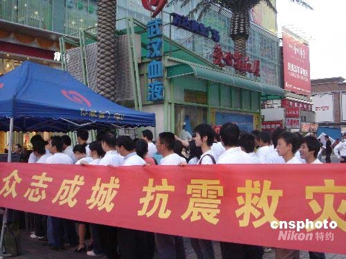 5月13日,驚聞四川地震災(zāi)區(qū)血液告急,同飲一江水的湖北武漢民眾主動走向設(shè)在三鎮(zhèn)街頭的采血點,挽起手臂捐獻血液,以備災(zāi)區(qū)不時之需。當(dāng)天,武漢市共有七百零八人參與獻血,共計采集九百四十三個單位、十八點八六萬毫升血液,兩項數(shù)據(jù)分別較平日增加了四成比例。中新社發(fā) 徐金波 攝