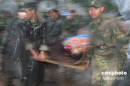 5月13日,中國(guó)空降兵6500多名官兵分別乘坐空軍遠(yuǎn)輸機(jī)奔赴四川重災(zāi)區(qū),分五路兵力,分別在什邡、德陽(yáng)、茂縣、等重災(zāi)區(qū)展開(kāi)救援。圖為解放軍士兵成功救出一名傷者。中新社發(fā) 譚超 攝