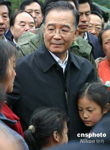 中國總理溫家寶十四日上午來到四川省北川縣看望受災群眾,在他向群眾講話時,雙手一直緊緊摟著兩個從北川中學塌陷的教學樓中逃生出來的孩子。中新社發 孫宇挺 攝
