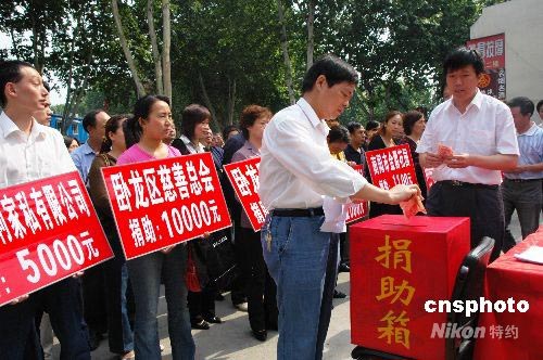 5月14日上午,河南省南陽市臥龍區(qū)組織的“情系四川汶川地震災(zāi)區(qū)捐助活動(dòng)”現(xiàn)場(chǎng),社會(huì)各界群眾在捐款箱前排成了長(zhǎng)隊(duì)。該區(qū)各企業(yè)和干部群眾大力發(fā)揚(yáng)“一方有難,八方支援”的精神,通過各種形式向?yàn)?zāi)區(qū)人民伸出援助之手,為災(zāi)區(qū)生產(chǎn)生活的重建貢獻(xiàn)力量。中新社發(fā) 熊運(yùn)彬 攝