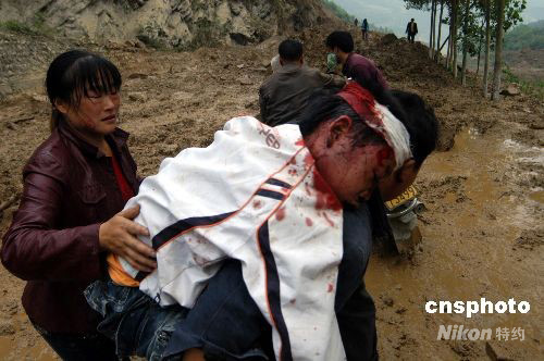 5月12日下午,四川綿陽平武縣平通鎮牛飛村五年級小學生楊豪在村民組織的自救中被救出。圖為當地村民背著楊豪到3公里外的村里找醫生救治。中新社發 成和平 攝
