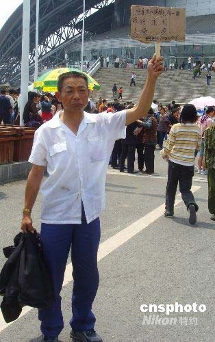 5月15日上午,來自受地震災害較為嚴重的四川綿陽安縣沸水鎮的一名男子來到綿陽市抗震救災最大的救助點——九州體育館外舉牌尋找親人。中新社發 霍潺 攝