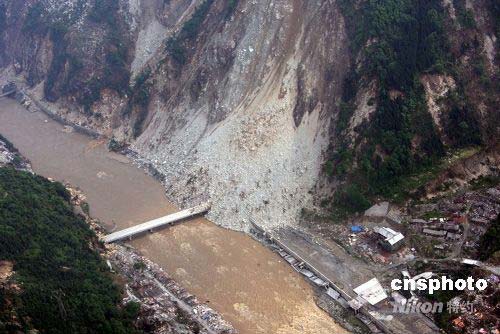 5月15日,在地震中中斷的汶川縣公路仍未完全修復,這是當日航拍的垮塌公路橋梁。此次大地震中,位于震中的汶川縣附近道路受到嚴重破壞,救災部隊、人員和醫療、生活物資遲遲不能從陸路進入。中新社發 張雷 攝
