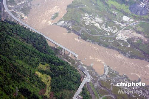 5月15日,在地震中中斷的汶川縣公路仍未完全修復,這是當日航拍的垮塌公路橋梁。此次大地震中,位于震中的汶川縣附近道路受到嚴重破壞,救災部隊、人員和醫療、生活物資遲遲不能從陸路進入。中新社發 張雷 攝