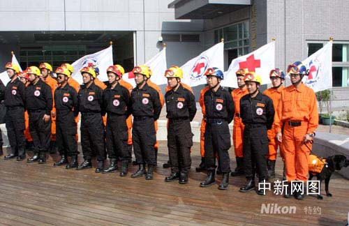 五月十六日下午,由臺灣紅十字會組織派遣的救援隊一行二十二人和一只搜救犬將乘包機直飛四川救災。圖為戎裝即發的搜救隊和搜救犬。作者:陳立宇