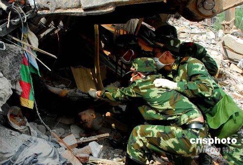 5月15日,在四川省綿竹市漢旺鎮(zhèn)地震重災(zāi)區(qū),數(shù)千名武警、消防官兵與時(shí)間賽跑,盡可能地?fù)尵让恳幻焕У臑?zāi)民。中新社發(fā) 陳進(jìn) 攝