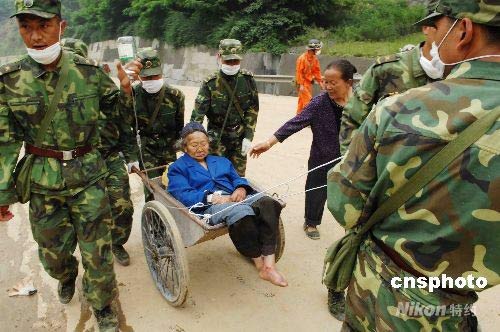 四川“5.12”大地震給北川羌族自治縣、汶川、都江堰等災區帶來特大災難,北川縣城遭到毀滅性重創。圖為北川災民在救援官兵幫助下撤往安全地帶。中新社發 陳文 攝