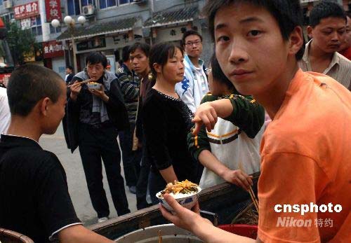 四川發(fā)生7.8級地震后,給震區(qū)民眾帶來巨大損失,四川各界民眾紛紛組成志愿者小分隊,以不同形式在地震重災區(qū)為災區(qū)民眾和支援抗震救災的人們提供無私服務。圖為來自農(nóng)村的青年們,在都江堰市將大桶的米飯、大盆的菜肴與飲用水分發(fā)給都江堰市災民和路人。中新社發(fā) 鄒憲 攝