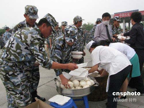 五月十六日十二點二十分許,一支從海南星夜兼程趕來的、有一千余名官兵組成的抗震救災(zāi)隊伍到達(dá)成都成南高速路口加油站,早早等候在這里的成飛賓館工作人員,迅速為戰(zhàn)士們提供上盒飯、饅頭等飯菜。僅二十分鐘戰(zhàn)士們就用完飯菜,稍事休整后就出發(fā)趕往受災(zāi)。中新社發(fā) 周丹鈺 攝