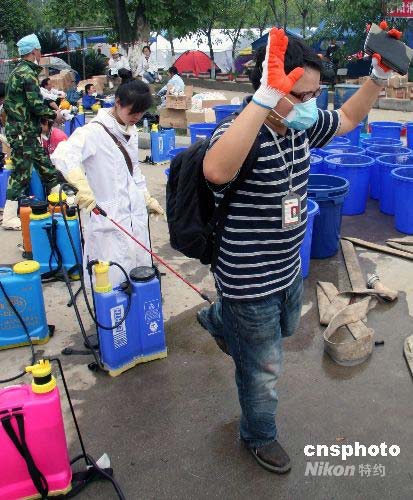 5月17日,四川綿竹漢旺地震災區衛生防疫人員展開消毒防疫工作,圖為衛生員為在災區采訪的記者消毒。中新社發 齊彬 攝
