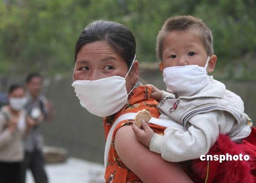 四川地震災區中的一對母子。 中新社發 曾憲平 攝