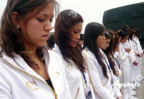 5月19日14時(shí)28分,為表達(dá)中國(guó)各族人民對(duì)四川汶川大地震遇難同胞的深切哀悼,中國(guó)國(guó)務(wù)院決定,2008年5月19日至21日為全國(guó)哀悼日。圖為正在中國(guó)廣西參加2008亞洲超級(jí)模特大賽的各國(guó)選手向四川汶川大地震遇難者默哀。中新社發(fā) 錢興強(qiáng) 攝